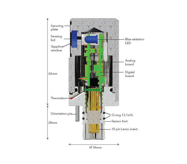 安德拉溶氧探头基于生命周期的荧光淬灭测量原理。它采用铂卟啉配合物作为荧光材料,嵌入在透气的荧光膜中,一层黑色的光隔离涂层保护荧光材料不受太阳光和水中颗粒荧光的影响。荧光膜一侧暴露于环境水体,另一侧安装在测量室的光学窗口上。通过蓝光激发荧光膜上的荧光材料,使其发出红光,检测器检测从发出蓝光到释放出红光的时间,该时间与溶氧浓度呈线性相关性,再经过温度补偿后得出溶氧浓度。基于生命周期的荧光淬灭测量原理与电化学传感器相比具有如下优点: