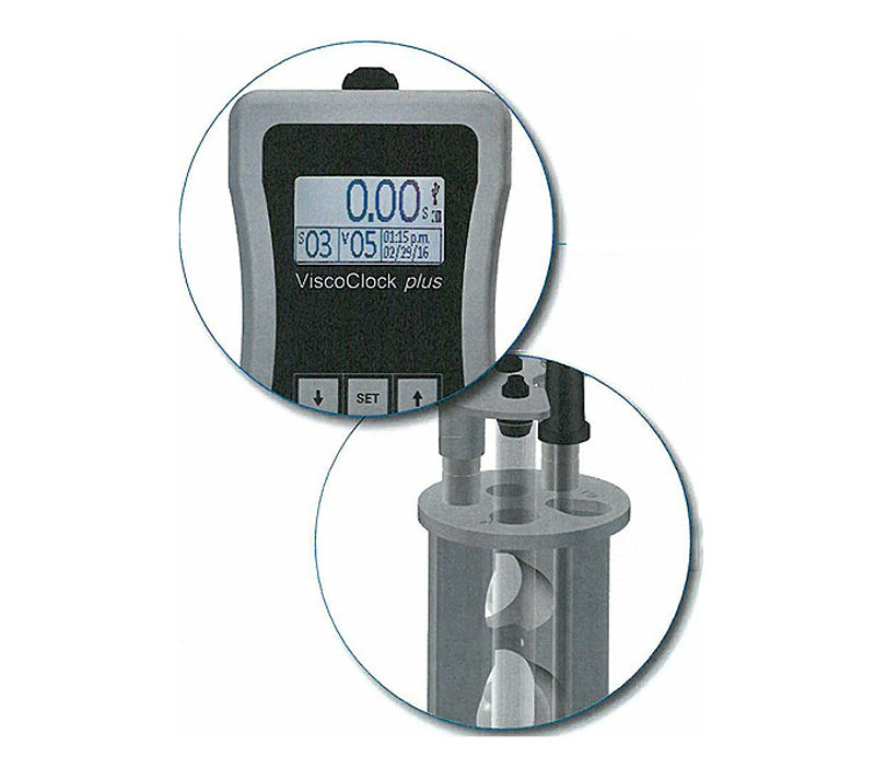 ViscoClockplus 是一个电子测时装置用于确定绝对和相对粘度。 它包含一个用于安装粘度计或电子测量单位的支架。 两个测量水平被合并至一个由PPA合成材料制成的支架上,电子测量装置包含在PP套管内。 大型LCD显示允许测量值可以被读取。